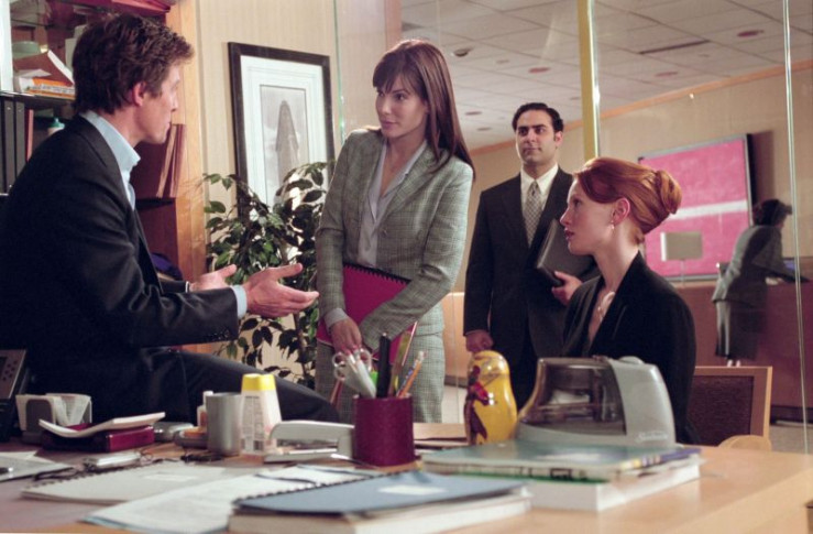 Noch bevor Lucy (Sandra Bullock, M.) ein offizielles Vorstellungsgespräch für ihre potentielle Nachfolgerin June (Alicia Witt, r.) arrangieren kann, bietet George (Hugh Grant, li.) dieser die Stellung an. (hinten Jason Antoon als Norman)