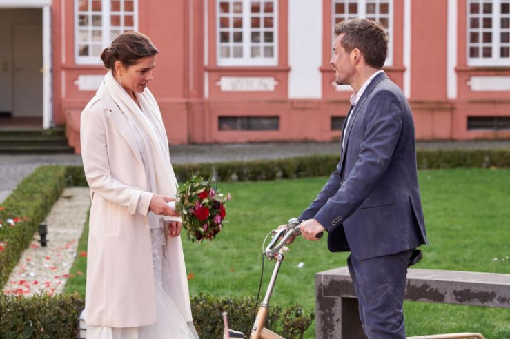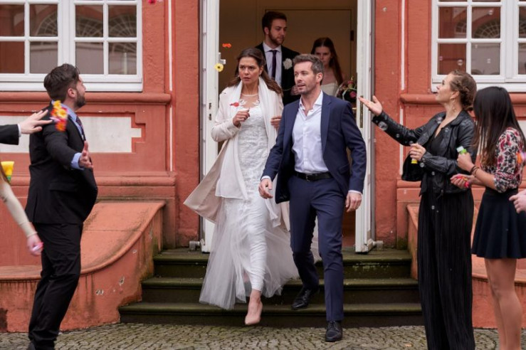 Alex Rode (Jan Hartmann) und Laura Seifert (Susan Hoecke) kommen aus dem Gebäude gelaufen und werden für das Brautpaar gehalten.