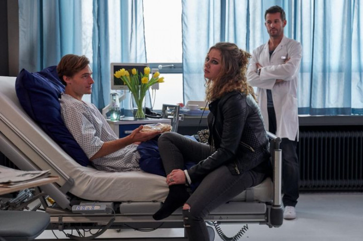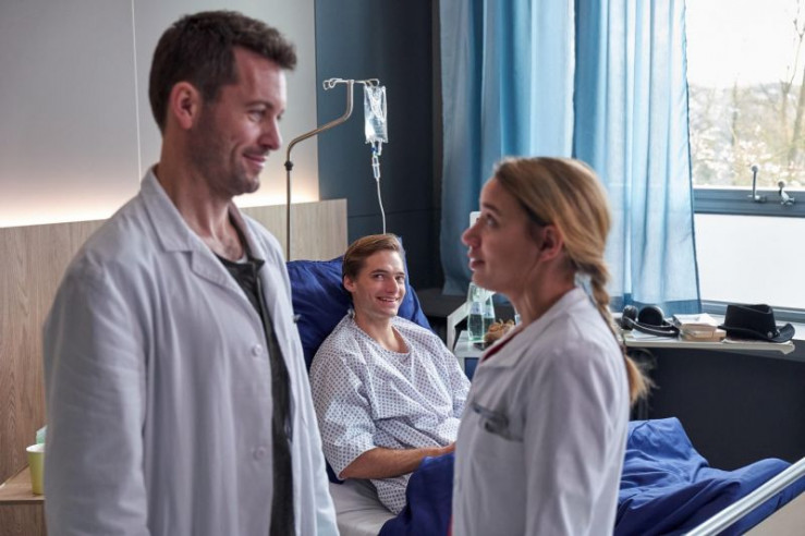Alex Rode (Jan Hartmann, l.) bemerkt, dass der Patient Pascal Vogt (Vinzenz Wagner) und Caro Diehl (Jytte-Merle Böhrnsen) sich sehr gut verstehen.