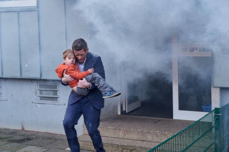 Alex Rode (Jan Hartmann) rennt in ein brennendes Haus und kann einen kleinen Jungen retten.