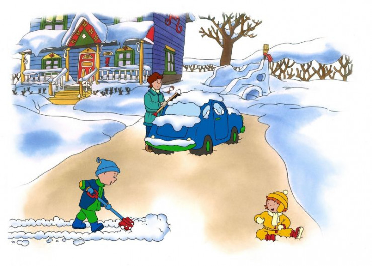 Caillou (li.) und seine Mami beseitigen die Schneemasssen in der Einfahrt. Auch Caillous Rosie (re.) macht sich nützlich.