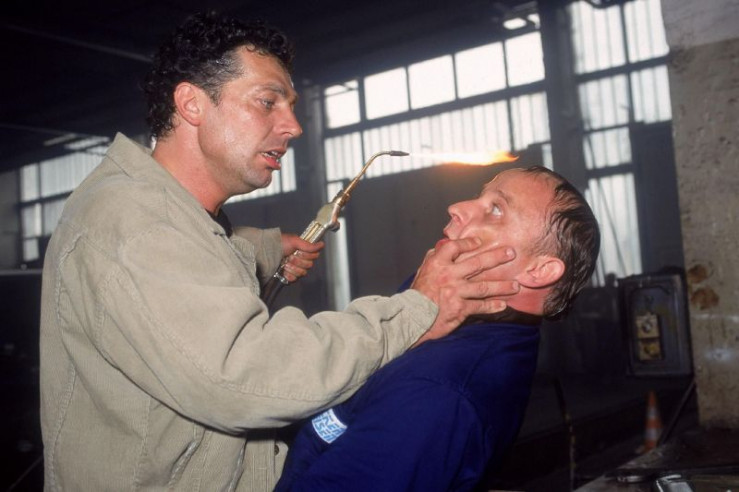 Gerber (Gregor Bloeb, l.) will mit allen Mitteln die Wahrheit über den Busunfall hören und versucht mit Gewalt ein Tatgeständnis von Ulrich (Alexander Held) zu bekommen...