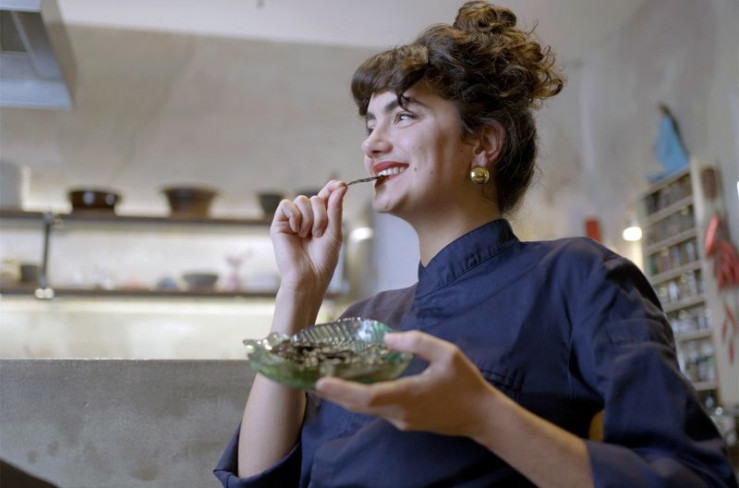 Lucie probiert ihre selbstgemachten Algenchips aus Wakame-Blättern.