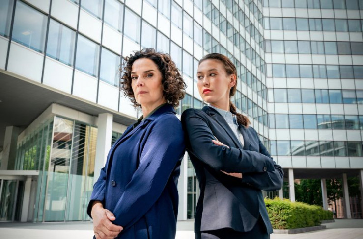 Die bekannte Sängerin Elisabeth ?Liz? Jordan (Larissa Sirah Herden, Mi.) mit ihrer Verteidigerin und einstigen Staranwältin Anna Conti (Désirée Nosbusch, 2.v.l.) unter Personenschutz auf dem Weg zur Beerdigung ihrer verstorbenen Tochter Zara