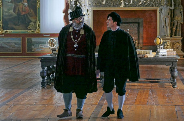 Tycho Brahe (Heiko Pinkowski, li.) begutachtet mit seinen Gehilfen das neu konstruierte Astrolabium.