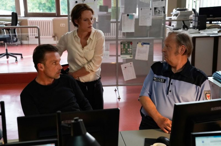 Kriminalhauptkommissarin Olga Lenski (Maria Simon, l.) befragt den Gutachter Johannes Schiller (Matthias Ziesing, vorne r.), dessen Ehefrau (Amélie Miloy) und seinen Bruder (Christian Beermann).
