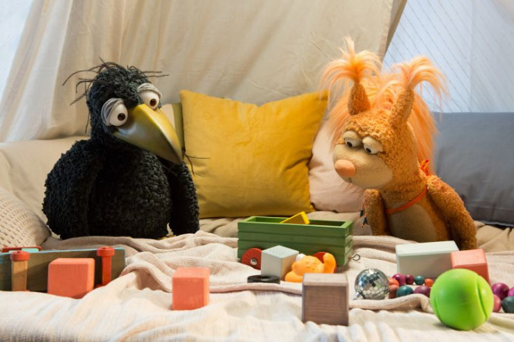 Rudi (Lennart Morgenstern) und Ella (Anna Menzel) müssen aufräumen. Denn gleich wollen sie es sich in der Kuschelecke bequem machen und das Märchen Frau Holle anschauen.