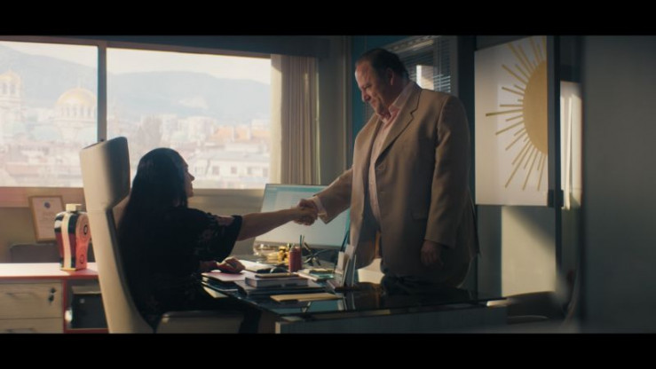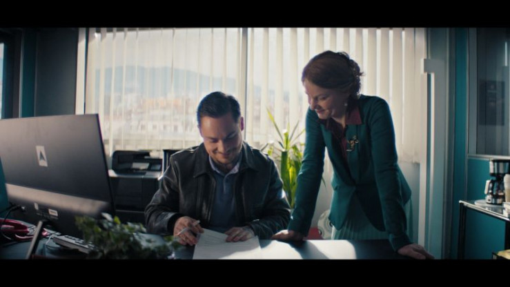 Frank Schneider (Andreas Anke, r.) fängt bei Ruja Ignatova (Nilam Farooq, l.) als Sicherheitsberater an.