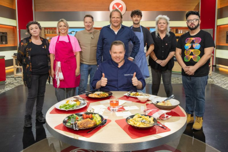 Gruppenfoto von links: Kandidaten Helene Mayrwöger-Heinetzberger, Carina Bonnett, Michael Gerhardy, Moderator Björn Freitag, Juror Richard Rauch, Kandidaten Marius Brüning-Wolter, Martina Bobrich und Rocco Fattizzo