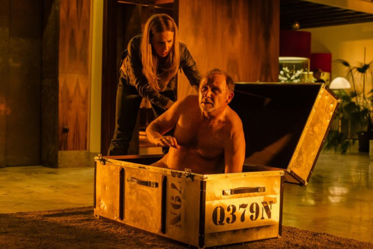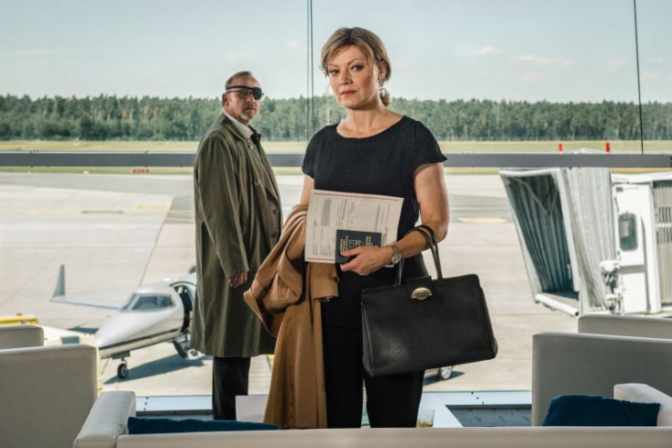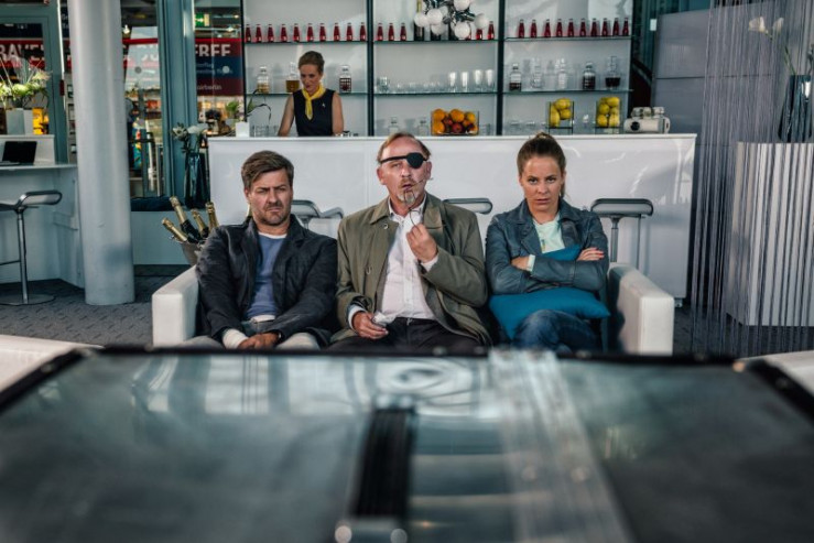 Die Kommissare Ludwig Schaller (Alexander Held, M.), Harald Neuhauser (Marcus Mittermeier, l.) und Angelika Flierl (Bernadette Heerwagen, r.) sitzen in der Flughafen-Lounge und warten darauf, die Diplomatin Victoria Sokol (Marion Mitterhammer) nun endgültig festzunehmen.