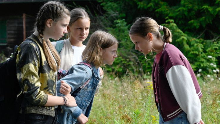 Paulina Groß (Medea Leinen, l.) und Elsa Heinemann (Rosa Mohnke, 2.v.r.) zerren Sarah Springer (Anna Triebel, 2.v.l.) zu Stella Lamprecht (Katharina Weitzendorf, r.).