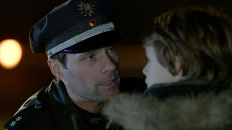Hans (Bruno F. Apitz, l.) und Franzi (Rhea Harder-Vennewald, M.) informieren René Stolze (Jan Pohl, r.) darüber, dass sein achtjähriger Sohn Markus von der Polizei an einem Fleet unter Schock stehend aufgefunden wurde.