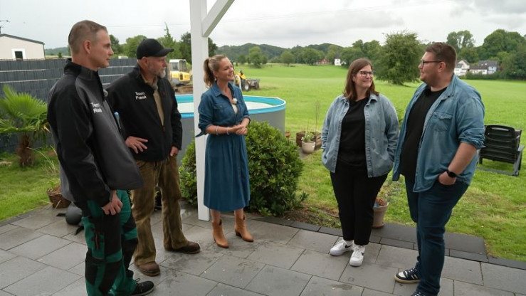 Zwei Mitarbeiter (l.) der "Gartenprofis" stehen mit Moderatorin Eva Brenner (M.) und Familie Wingchen (r.) im Garten.