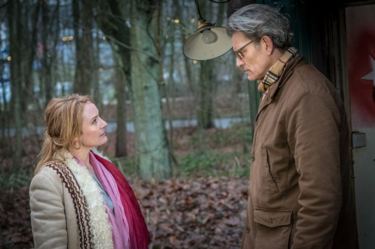 Richard Lier (Götz Otto, r.) und Helena Lier (Tara Marie Linke, l.) treffen am alten Bauwagen der Lier-Schwestern unverhofft aufeinander.