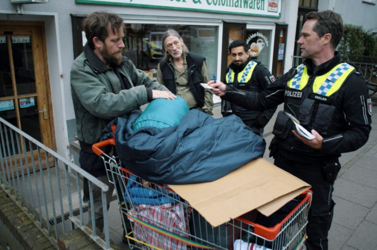 Malik (Zejhun Demirov, M.) und Mattes (Matthias Schloo,r.) befragen noch einmal den Obdachlosen Dennis Freese (Jannik Nowak, l.), weil sie das Gefühl haben, dass er mehr weiß, als er ihnen erzählt hat.