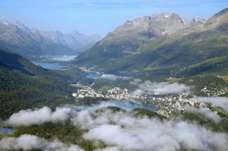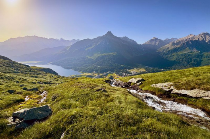 Unterwegs in den Schweizer Bergen: Blick auf St.Moritz und die Oberengadiner Seen im Sommer von Segantini Hütte aus.