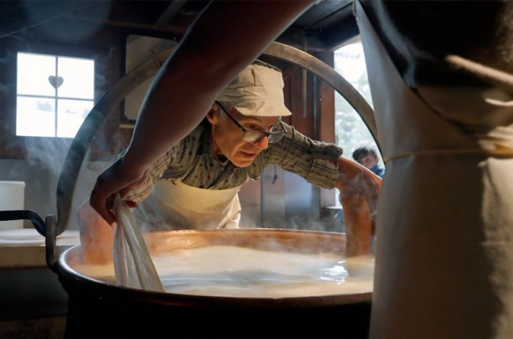 Engadin in den Schweizer Alpen: Käser Konrad Schmid am Milchkessel in der historischen Schaukäserei Morteratsch bei Pontresina.