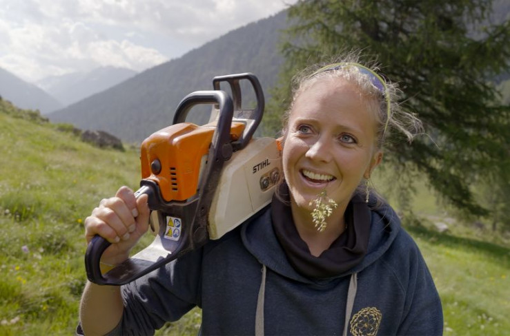 Holzbildhauerin Nora Engels läuft mit Motorsäge auf der Schulter einen Berghang im schweizer Oberengadin hinauf.