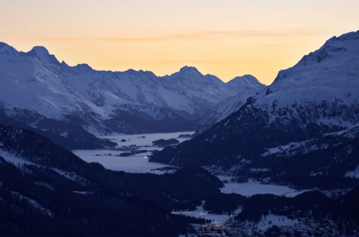 Schweizer Berg-Impression: Blick auf verschneites Oberengadin im Sonnenuntergang von der Bergstation Muottas Muragl aus.