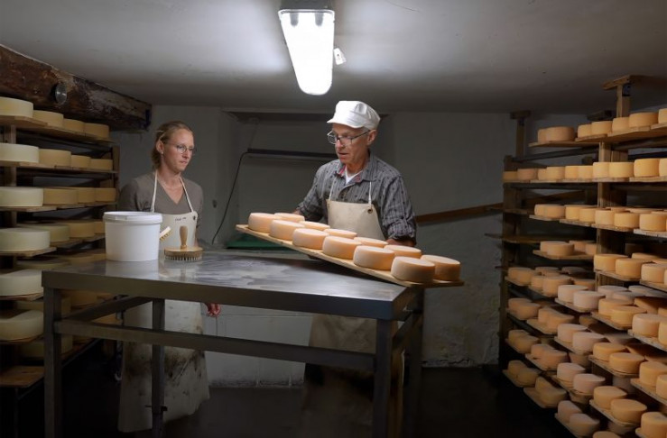 Käser Konrad Schmid mit Praktikantin in der Käsekammer der Schaukäserei Morteratsch bei Pontresina in den Schweizer Alpen.