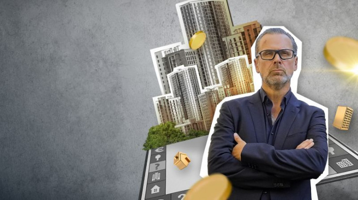 Als "Immobilienhai" unterwegs: Schauspieler Matthias Matschke vor einem Plakat mit der Fassade eines mehrstöckigen Neubaus.