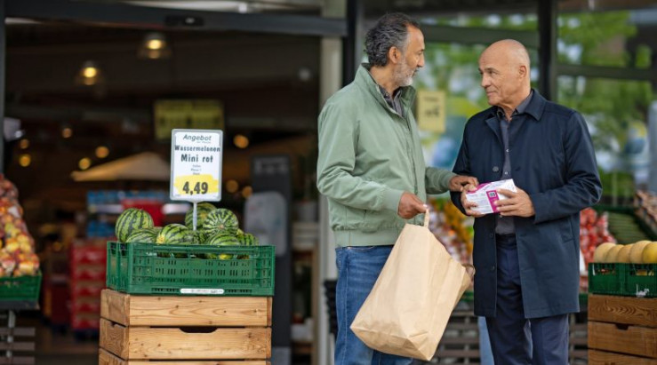 Frauen-Notfall im Schülerladen: Gerhard (Heiner Lauterbach, rechts) muss für Yasmin Binden kaufen und trifft im Supermarkt ausgerechnet auf ihren Onkel Aydin (Ercan Durmaz, links).