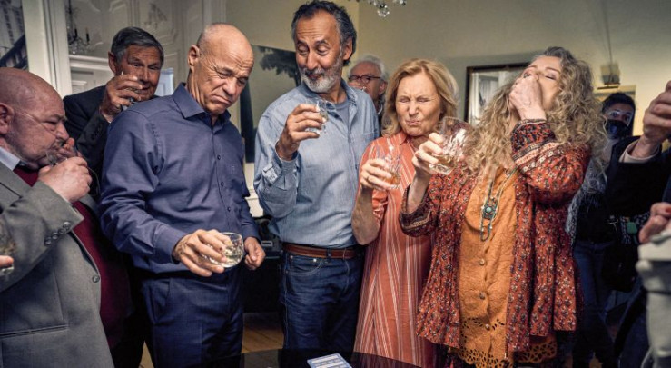 Fast das Feiern verlernt: Erst als der pensionierte Arzt Gerhard seine Medikamentenkiste mitbringt, wird die lahme Senioren-Party lustig, von links: Gerhard (Heiner Lauterbach), Aydin (Ercan Durmaz), Karin (Maren Kroymann), Philippa (Barbara Sukowa).