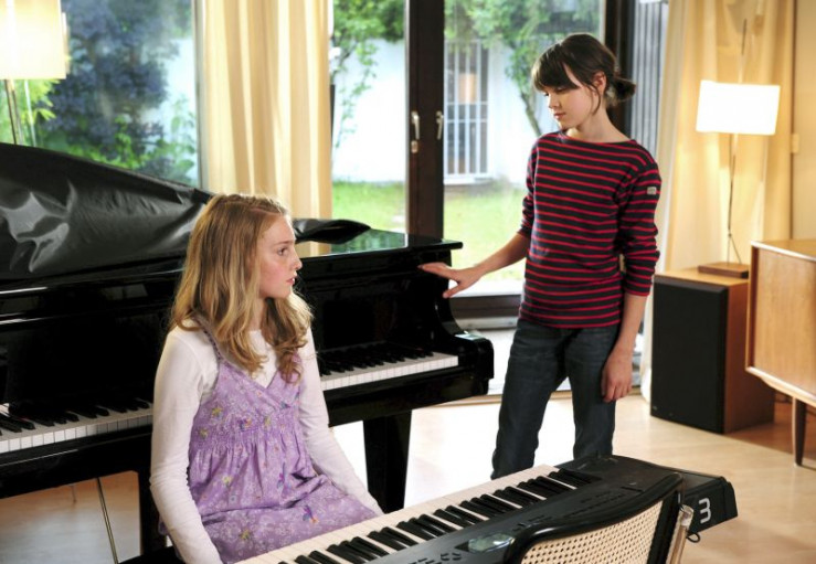 Alex (Jörg Schüttauf) erklärt Sophie (Julia Richter, rechts) und Paula (Grace Reutlinger, Mitte), dass seine Tochter Charlie (Annika und Francesca Bolkart, hinten) so gereizt reagiert, weil Paula auf dem Flügel ihrer verstorbenen Mutter musiziert hat.