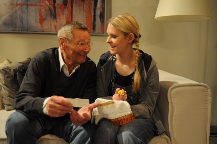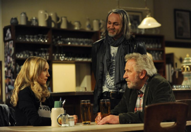 Yvi freut sich über ihren neuen Talisman. Von links: Alois Preissinger (Erich Hallhuber), Mike Preissinger (Harry Blank), Yvonne Preissinger (Alexa Eilers) und Trixi Preissinger (Doreen Dietel).