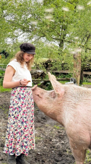 Milchbäuerin Maren und ihr Hausschwein Rosalie.