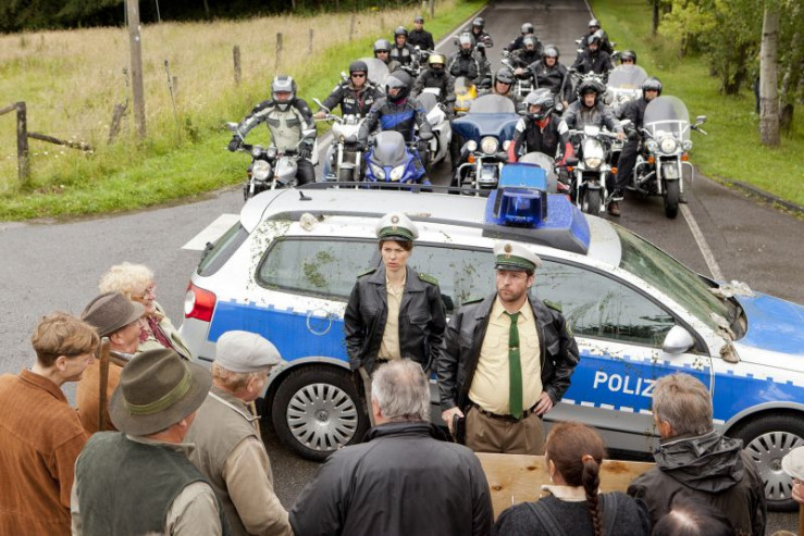 Dietmar Schäffer (Bjarne Mädel, l.) und Sophie Haas (Caroline Peters, r.) beenden die Schlägerei der Biker und Hengascher vorm Gasthof Aubach.