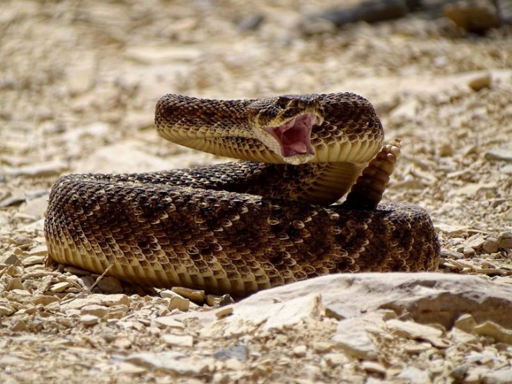 Western Diamondback Klapperschlange (Crotalus Atrox) zusammengerollt und mit weit offenem Maul.