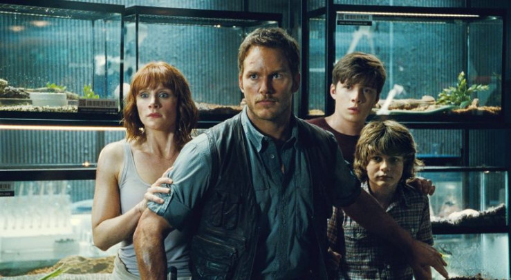 Das Unglück scheint sich im neuen Freizeitpark "Jurassic World" zu wiederholen: (V.l.:) Claire (Bryce Dallas Howard), Owen (Chris Pratt), Zach (Nick Robinson) und Gray (Ty Simpkins) kämpfen um ihr Leben.