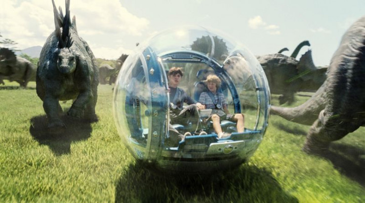 Um den Besuchern des Parks ein besonderes Erlebnis bieten zu können, können diese die Dinosaurier in steuerbaren Kugeln im freien Gelände beobachten. Zach (Nick Robinson) und Gray (Ty Simpkins, r.) ahnen nicht, in welcher Gefahr sie sich befinden.