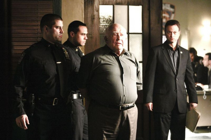 Ein Neonazi wird in seinem Büro angeschossen und stirbt späer an seinen Verletzungen. Aufgrund einer Zeugenaussage gelingt es Detective Mac Taylor (Gary Sinise, r.) und den Polizisten (Darsteller nicht zu ermitteln), den jüdischen Uhrmacher Abraham Klein (Edward Asner, 2. v. r.) ausfindig zu machen. +++ Die Verwendung des sendungsbezogenen Materials ist nur mit dem Hinweis und Verlinkung auf RTL+ gestattet. +++