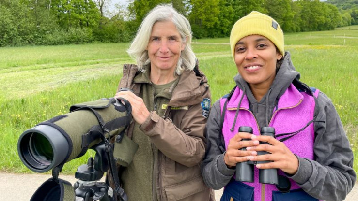 Pia macht sich mit Naturpark-Rangerin Martina auf die Suche nach einem Tier, das seine Beute in der Hecke aufspießt. (Martina Faber)