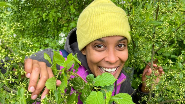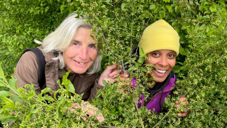 Wildlebensraumberaterin Franziska hilft Pia dabei, in der Hecke die Zutat für ein natürliches Juckpulver zu finden. (Dr. Franziska Müller-Waldeck)