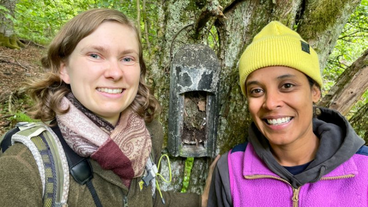 Pia und Naturpark-Rangerin Amelie haben das Nest einer Haselmaus gefunden. (Amelie Nöth)