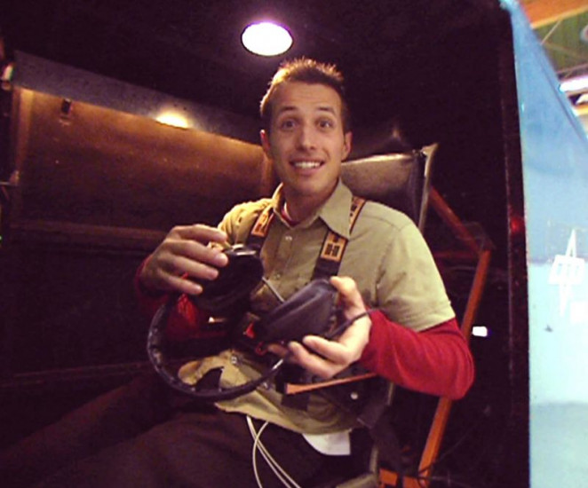 Willi mit einer Nasenklemme im ESA-Trainingszentrum, der Ausbildungsstätte für Astronauten. Er trainiert in einer Zentrifuge, auf einem Drehstuhl, der sein Gleichgewichtssinn testet, und simuliert einen Notfall in der Raumstation.