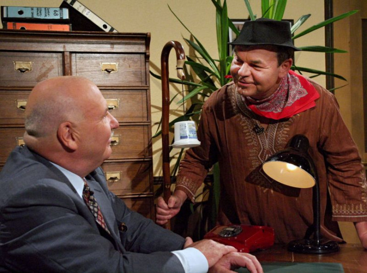 Hannes (Albin Braig, re.) ist durch eine Erscheinung, die er hatte, ein berühmter Pilgerführer geworden. (li: Bürgermeister (Karlheinz Hartmann).