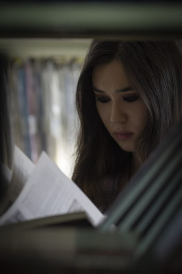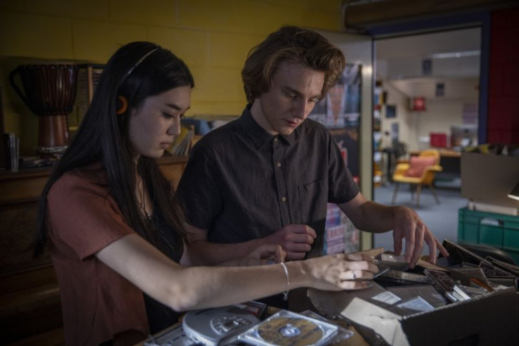 Chester (Henry Strand) und Violetta (Hannah Ogawa) durchstöbern CDs in der Bibliothek.