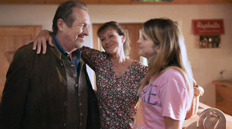 Dr. Phillipp Hartmann (Jakob Graf, l.), Sophia Strasser (Katharina Goebel, r.) und Jerry Paulsen (Peter Marton, 2.v.r.) werden in den Berchtesgadener Kurgarten gerufen. Eine junge Mutter wurde brutal zusammengeschlagen.