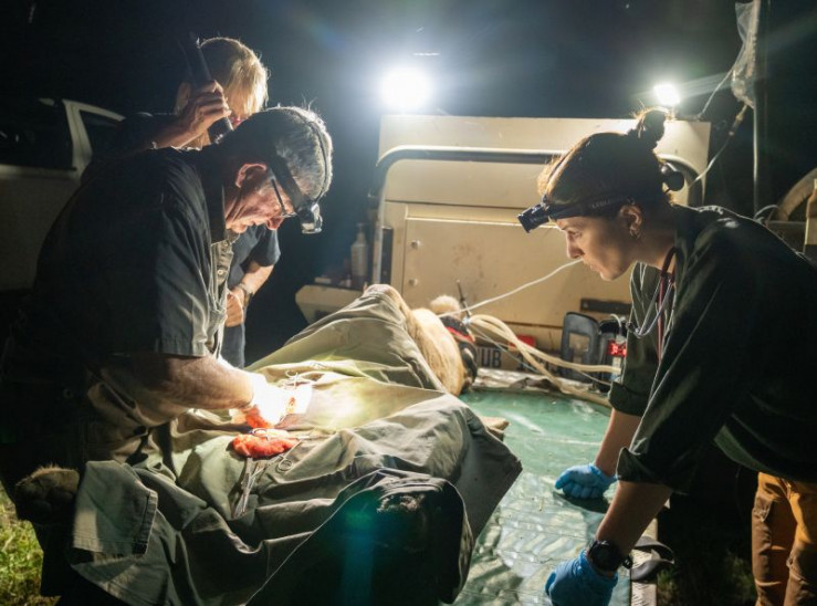 Hannah Emde (r.) überwacht die Atmung einer Löwin bei einer Operation im Wildtierreservat Somkhanda, Südafrika.