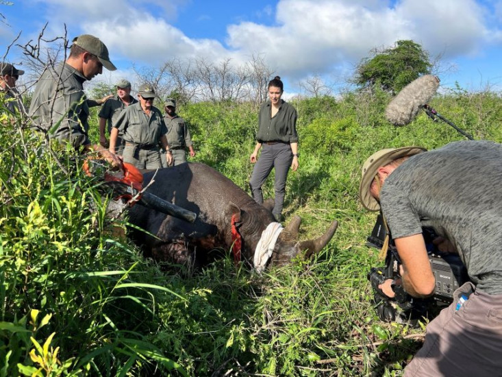 Das "Terra X: Faszination Erde"-Team mit Kameramann Riaan Venter (r.) und Hannah Emde (2.v.r.) begleitet eine spektakuläre Schutzmaßnahme für Nashörner, das so genannte "Dehorning". Dem Nashorn werden die Hörner abgesägt, damit sie für Wilderer unattraktiv werden. Jeden Tag wird in Südafrika mindestens ein Nashorn getötet. Ihr Horn ist auf dem Schwarzmarkt fast so viel wert wie Gold.