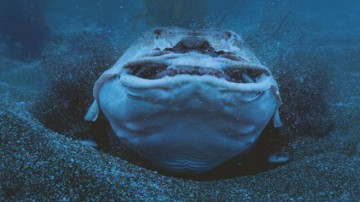 So wenig der Name Teufelsrochen zu dem geselligen Riesenmanta passen will, so wenig engelsgleich verhält sich der Meerengel. Der kleine Hai mit dem himmlischen Namen hat - anders als seine Verwandten - einen flachen Körper. Damit kann er sich wunderbar am Meeresgrund verstecken. Auf seinem Kopf besitzt er Öffnungen, sogenannte Spritzlöcher. Mit ihnen kann er wie ein Staubsauger im Rückwärtsgang Sand über seinen ganzen Körper verteilen. So getarnt verharrt er wochenlang, bis sich ein ahnungsloses Beutetier nähert. Mit einem erstaunlich schnellen Schnapper schlägt der Engelshai zu und verschluckt sein Opfer in einem Stück.