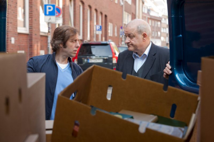 Ekki (Oliver Korittke, l.) will die Kartons nicht ausladen. Wilsbergs (Leonard Lansink, r.) Bücher wurden gepfändet.