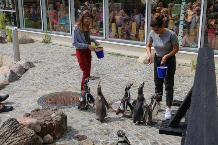 Was fressen Pinguine? Alexa (l.) und Feli (r.) versuchen es mit Fisch, beobachtet von Besuchern des Zoos.