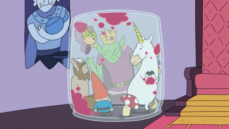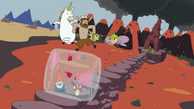 Auf der Mission: Um das geklaute städtische Marmeladenglas aus den Klauen des Koboldkönigs (r.) zu befreien, kommandiert Hufius (oben, M.) mit den Klängen der magischen Panflöte seine Freunde, Blümchen (oben l.) und Twinkle (oben, r.) sowie Herbert (unter, l.) und Tupfen (unten r.), herum.