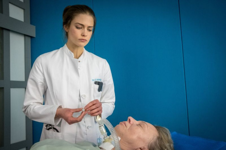 Dr. Eva Grünberg (Laura Berlin, l.) hadert mit sich. Sie hat sich Hanna Jacobs' (Komparsin) Mann gegenüber nicht sehr einfühlsam benommen.