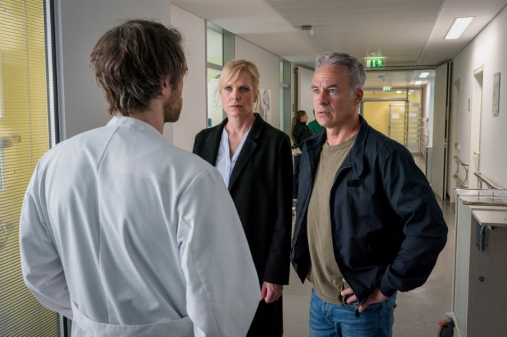 Benni Maybach (Maximilian Klas, l.) berichtet Ina Zimmermann (Melanie Marschke, M.) und Jan Maybach (Marco Girnth, r.), wie es um den Mann steht, der bei einem Überfall auf ein Baustoffcenter angeschossen wurde.